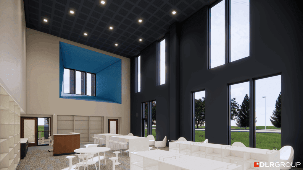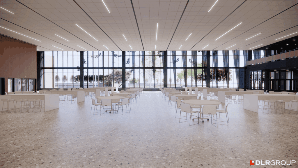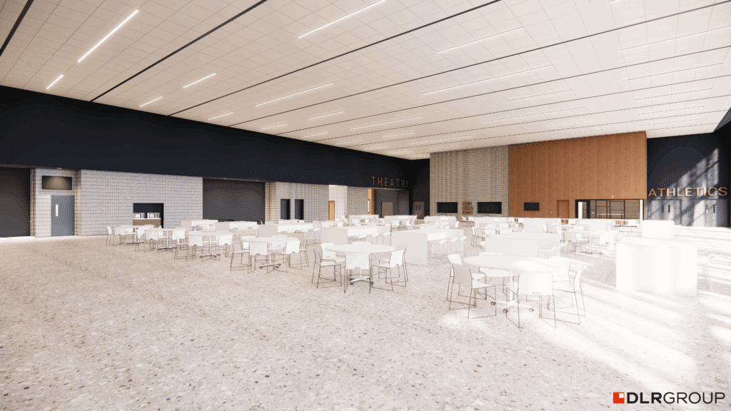 Athletic amenities are being developed alongside the building and include new baseball and softball fields, a track, a football field, and a grandstand. Together, these outdoor facilities will support a wide range of athletic programs while also serving as a community resource.
