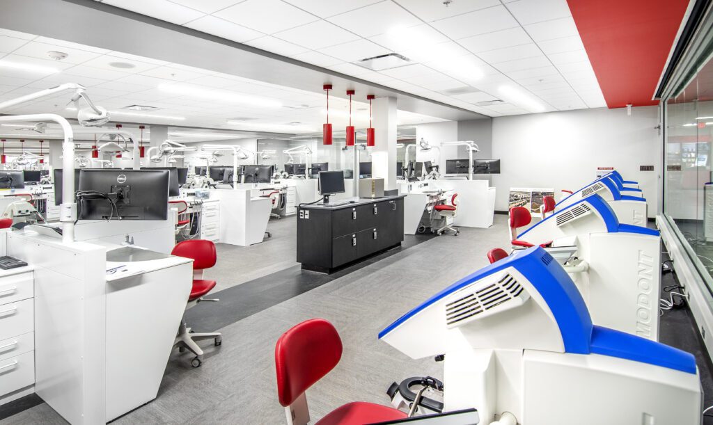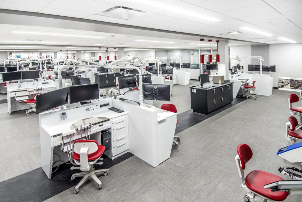 Remodeling the 64-station clinical and virtual simulation dental laboratory, this 6,500 square foot project features virtual dental trainers with cutting-edge 3D and virtual reality technology. It includes a 700 square foot, 15-station digital design studio.