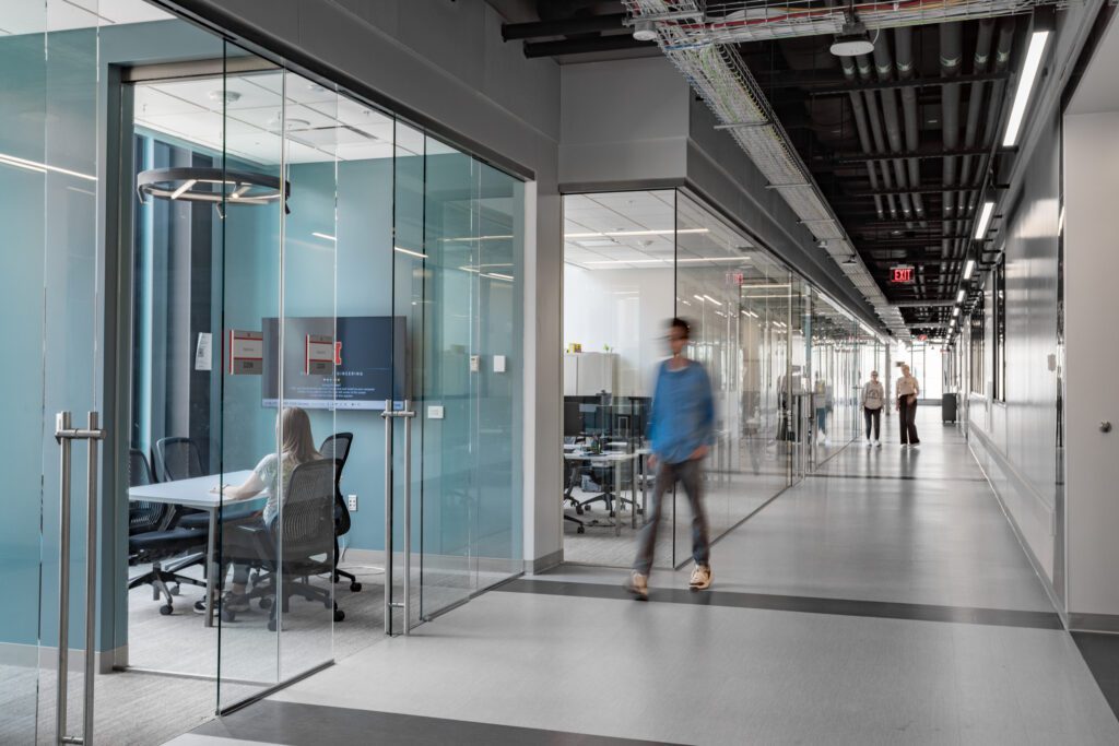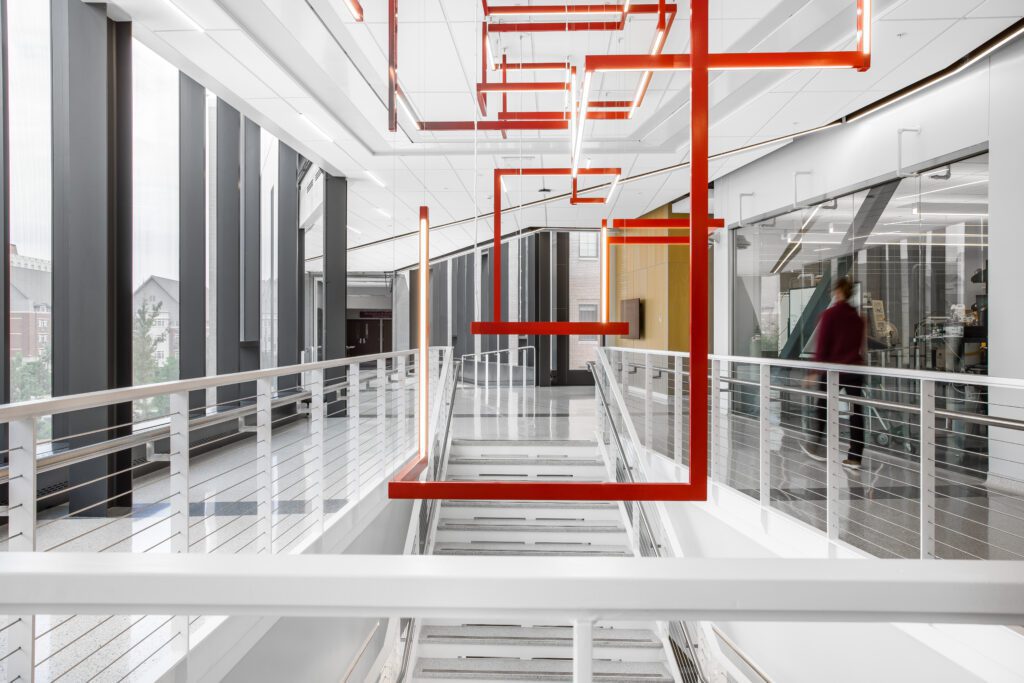 A striking new entryway with a glass curtainwall and stone veneer, anchored by a grand staircase, provides a focal point for the building and enhances wayfinding throughout the complex. The project demanded careful staging and sequencing, as it was completed on a fully occupied campus with a limited site almost entirely consumed by the building footprint. Despite these challenges, the revitalized facility now provides advanced teaching and research environments that position the College of Engineering for future growth.