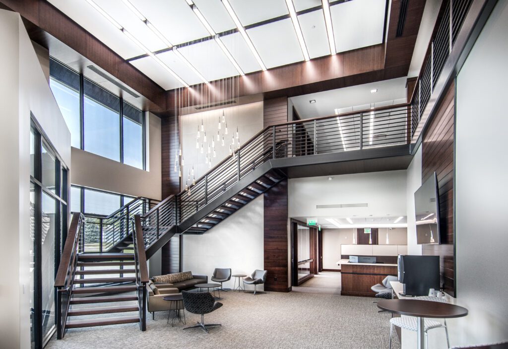 This 20,600 square foot, three-story new bank features a decorative staircase and atrium lobby open to the second level. The building includes teller stations, conference rooms, open-concept desk space, second-floor executive offices, and a walk-out basement. Site work includes a multi-car drive-through with an integrated pneumatic tube system.